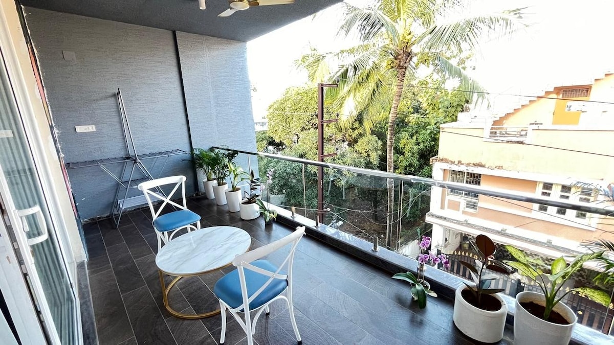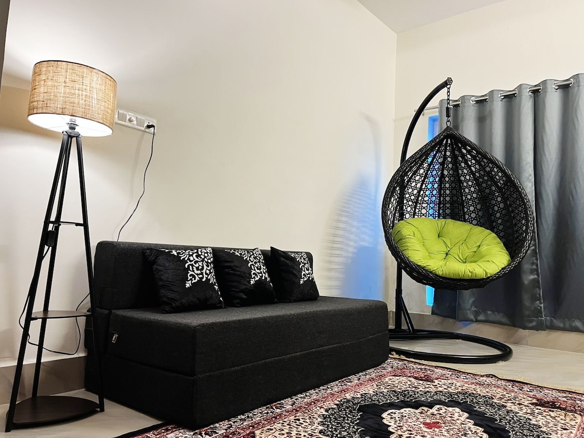 A fully furnished cozy private studio 1 bhk with all the amenities of a home, away from home. Kitchen is well equipped with a water purifier, induction cooker and a microwave with automatic chimney, a Geyser for hot water and a 1.5 ton air conditioner with a low level bed for a peaceful sleep at night. The hall has a Diwan bed cum Sofa & a 44 inch smart TV for entertainment with a 100 Mbps Wifi for your work from home needs. Forget your worries in this spacious and serene space.