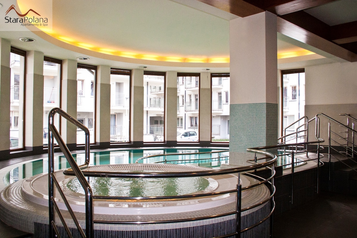 Prezentujemy klimatyzowany apartament z antresolą. Sypialnia pod szklanym dachem oraz całoroczne zewnętrzne Spa, to niewątpliwie "wisienka na torcie". Kameralne 2-4 os mieszkanie z dostepem do windy dysponuje także salonem, wyposażonym aneksem kuchennym, łazienką z pralką oraz miejscem postojowym w garazu podziemny.Wspaniała lokalizacja w centrum zapewnia szybki dostep do wielu atracji.