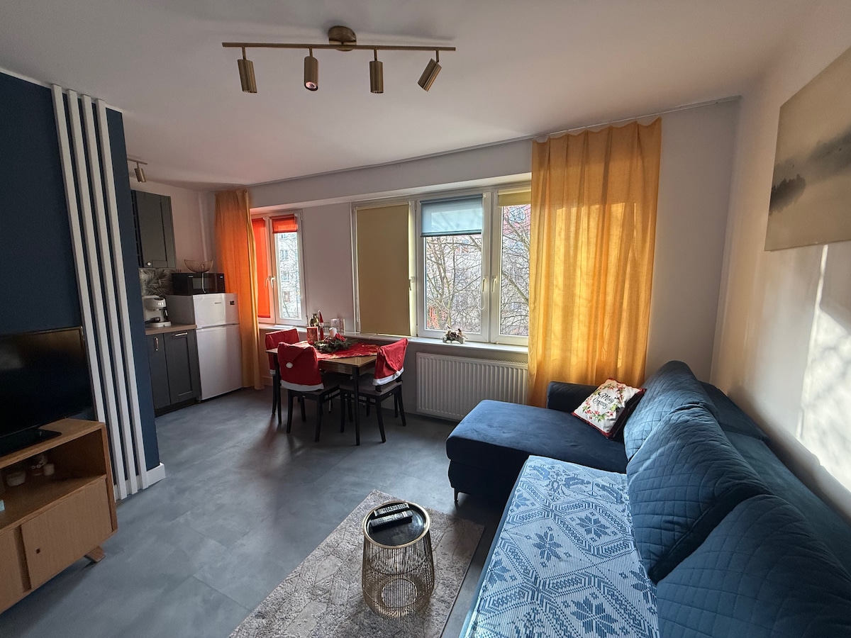 Nowoczesny, 2-pokojowy apartament urządzony w stylu skandynawskim, położony na spokojnym osiedlu tuż przy centrum miasta. Mieszkanie jest całkowicie wyposażone i gotowe do zamieszkania. Znajduje się w nim część wypoczynkowa w postaci salonu z rozkładaną sofą (powierzchnia spania dla dwóch osób 140 x 200 cm), w pełni wyposażona kuchnia (lodówka, piekarnik, zmywarka), bardzo duży balkon, sypialnia z łóżkiem o powierzchni spania 140 x 200 cm oraz łazienka z kabiną prysznicową i pralką.