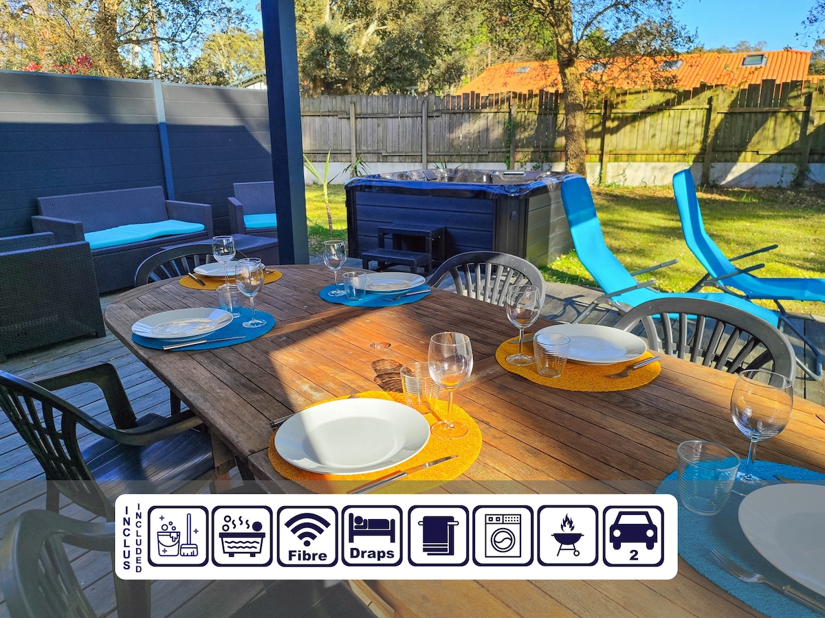>>> Ménage de fin de séjour INCLUS >>> Lits FAITS, serviettes, torchons INCLUS >>> Produits de base présents (PQ, gel douche, shampooing, sel, poivre, huile, vinaigre...) >>> Panier d' accueil (café, thé, vin local...) Maison cosy 55m² / 2 chambres Climatisées Plage à pied Tout confort, au calme, très lumineuse SPA gonflable PRIVATIF 35°C Jardin clos, plancha, hamac, mobilier de jardin 2 Places de parking privées devant le logement Matériel bébé Lave linge, sèche linge, lave vaisselle Wifi fibre