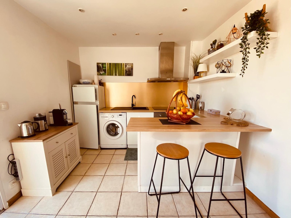 T2 (+cabine) entièrement refait en merisier (massif/sur-mesure) au rez de chaussée dans une résidence calme et arborée Cuisine lave-vaisselle micro-ondes frigo/congélateur café Salle de bain (douche lave linge) Salon avec TV home cinéma (wifi/netflix) Un accès privé sur le parc de la résidence Parking au pied de la résidence Proximité plages et tous les commerces du penon Piste cyclable au pied de la résidence. Possibilités de prêter 2 vélos Tennis dans la résidence chien ou chat autorisé