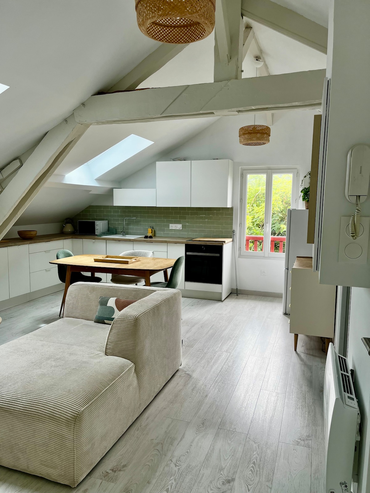 Appartement T3 familial, proche de la plage et du village. Il est situé à 5 min à pieds de la plage des Embruns et de Bidart centre, et à moins de 10 min de la place du village (bars, restaurants). Une place de parking privative est à disposition au sein de la propriété privée. Appartement mansardé, refait à neuf, très lumineux et fonctionnel, sans vis à vis. Climatisation et ventilateur disponibles. Bornes de recharges pour véhicules électriques situées à 10 minutes à pieds.