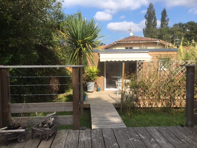 Maisonnette en bois comportant une grande chambre avec un lit double 140 X 200, un espace de travail, un petit salon espace repas, une kitchenette, une salle d'eau, une terrasse et un petit jardin. Lieu très calme au fond d'une impasse au sein d'un lotissement, proche des plages de Seignosse, Hossegor, Capbreton... Golfs à proximité, Bayonne à 30 mn, frontière espagnole 45 mn et aux portes du pays basque.