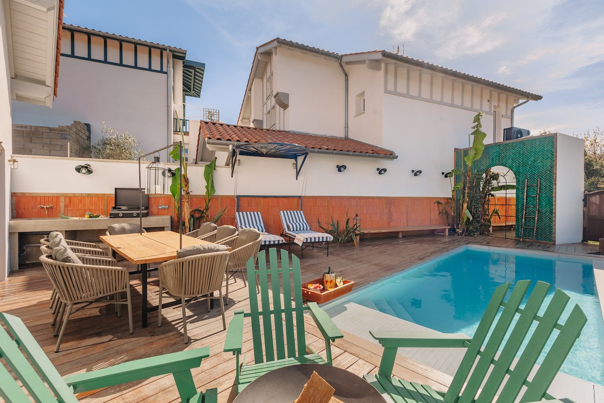 Maison neuve de 100m2 entre mer et golf, très lumineuse , vue sur le golf de Biarritz , spacieuse avec deux chambres se situant à cinq minutes à pied de l'océan, où vous pourrez dîner dans de nombreux restaurants. Commerces en bas de la rue. Parking et jardin de 3500m2 ambiance balinaise/ japonaise avec transat, coin tchill, barbecue , brasero ...ambiance zen garantie :)