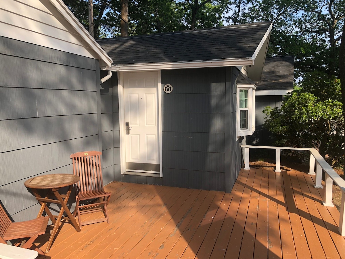 We’re a small 1950s boutique motel in a tranquil setting just 1.5 miles outside of downtown Portsmouth and Kittery Foreside. Pull up and park directly in front of your room. Need some fresh Maine air? Just open the windows in your room or get your fill while sitting outside on one of our private decks, by our outdoor pool (early June to mid Sept)) or in our grassy common area.