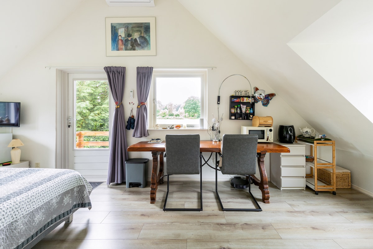 Experience the charm of our spacious and serene studio, nestled in a quiet, green setting on the outskirts of Lelystad—just 45 minutes from Amsterdam. This warm and inviting open space is surrounded by a peaceful garden, offering the perfect environment to relax, unwind, and recharge. Enhance your stay with the ultimate wellness experience in your private wood-fired sauna (€45 per session, approx. 4 hours), ensuring deep relaxation in complete privacy.