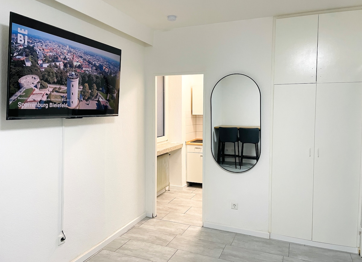 Super Lage in Bielefeld! Altstadt, Kesselbrink und Städtisches Klinikum Bielefeld zu Fuss schnell erreichbar. 1- Zimmer Wohnung im 1. Stock. Kostenloses WLAN (500mbit/s). Küche ausgestattet. Leicht mit öffentlichen Verkehrsmittel zu erreichen. Ideal für Singles, Pärchen oder Geschäftsreisende. Wochenrabatt 10%, 2-Wochenrabatt 18% und Monatsrabatt 35%. REWE (7-20Uhr) auf gegenüberliegender Straßenseite.