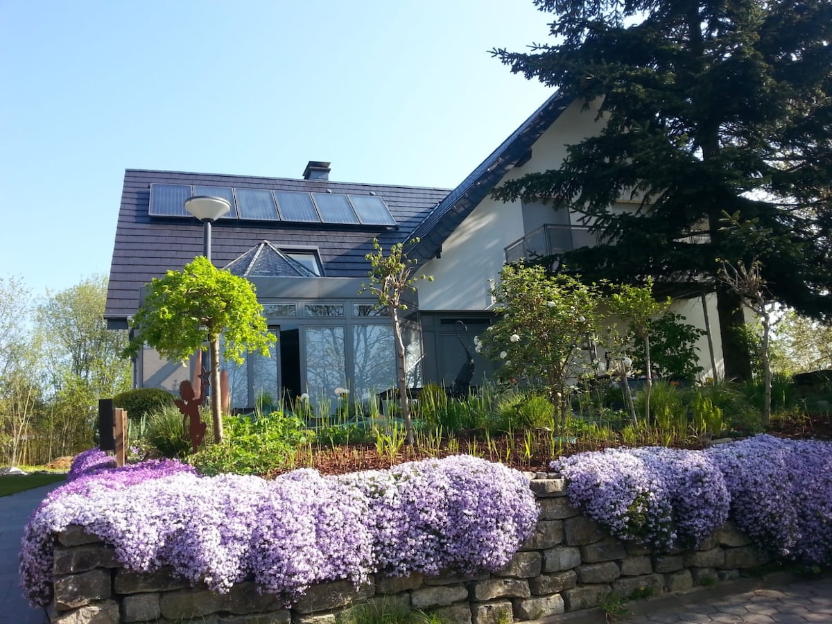 100 qm, 1-6 Personen 1 großes Bett 2 Schlafsofas 1 Reisekinderbett, Waldblick Wintergarten + Terrasse Grill + Garten, Bose Box, Parkplatz auf Grundstück + Fahrradgarage abschließbar, Gartensofa + Strandkorb, Induktionsherd+Airfryer+Kaffeevollautomat+KitchenAid, begehb. Kleiderschrank, Wohnzimmer, Esszimmer, Bad/Dusche ebenerdig + Fußbodenheizung, überall Parkett, Abstellkammer, Garderobe. Nah bei: Einkaufen Bank Apotheke Bäcker, Buslinie ins Zentrum, am Teutoburger Wald/Lutter, nah zur A33.