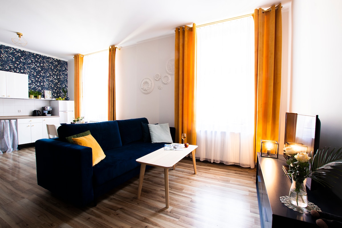 Komfortowy apartament w centrum miasta. Do dyspozycji całe mieszkanie 48 m - sypialnia z podwójnym łóżkiem oraz salon z aneksem kuchennym. W salonie rozkładana sofa . W pobliżu główne zabytki miasta. ( 400m ratusz miejski, 950 m - rynek starego miasta, zamek). Dostępne 1 bezpłatne miejsce na prywatnym zamykanym parkingu, tuz obok budynku. Ponadto w pobliżu również miejski parking (od godz.17 oraz w weekendy bezpłatny).