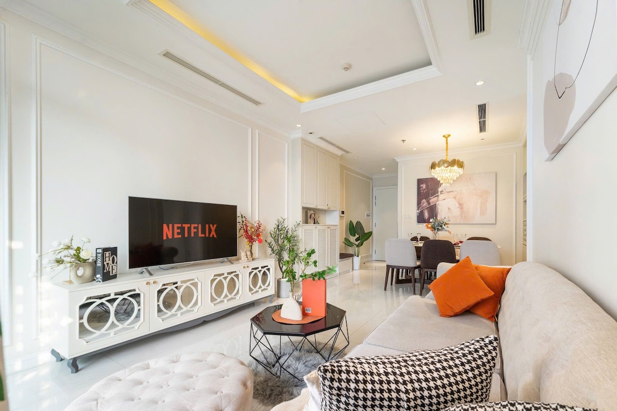 - Located at Master Centre Point, Vinhomes Grand Park, near Vincom Mega Mall and Winwonders Water Park and Theme park. - The apartment is clean and beautiful, with comfortable bedding sets. - Strong WiFi for both work and entertainment. - Full and Modern amenities: big refrigerator, induction stove, microwave, washing machine, smart 65-inch TV, kettle, rice-cooker, hair dryer, iron, umbrella, Lavie mineral water, seasonings... - Fitness/gym center and swimming pool are included for guests.