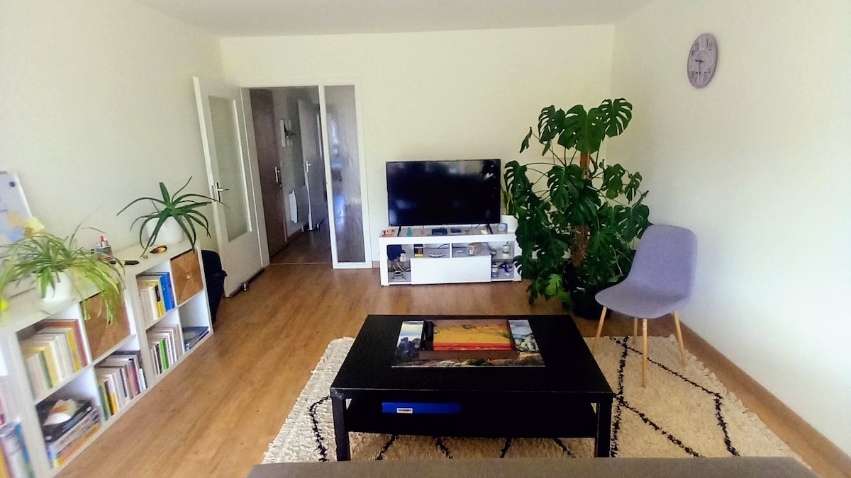 Comfortable flat of 85 m² close to center and in quiet location. Pleasant layout of rooms. Comprises 2 bedrooms with double bed, bathroom, kitchen with bar, living room with office and dining area, terrace, hall and separate toilet. Sofa converts to 3rd double bed. Furbished with care and provided with all the necessary amenities. Free mini bar. Grocery store on site. Free parking. Town center and LLN train station 10 min walk. Walibi 6 minutes by car, Ottignies station 20 min by bus 31