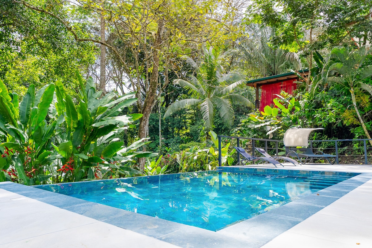 Serene, beautiful 2 BR/3BA open concept home with infinity pool bordering Manuel Antonio National Park. Last home on a quiet street in the community of Colina Monito. Frequented by wildlife as the house borders the National Park- it’s as though you’re staying in the park! Minutes away from shopping and local restaurants, yet private. Concierge service and maid service included along with many amenities. Short drive to the beach. Also NEW modern bathrooms and NEW path to the waterfall!