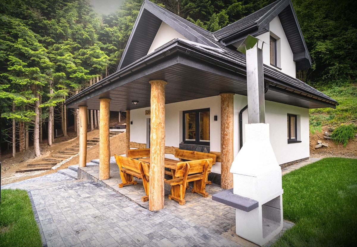 Są to domki wykonane z drewna pół bala w stylu góralskim z pięknym widokiem na jezioro Solińskie odległość do jeziora z ośrodka 40 metrów z własna plażą