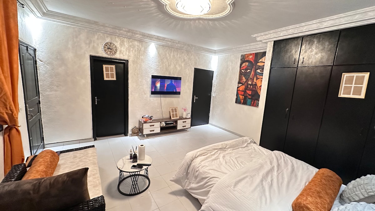 Beau studio sécurisé avec gardien de jour et de nuit.Accès facile Rez de Chaussée avec ouverture sur une petite terrasse. il dispose d'un grand écran de 55 pouces, un coffre fort, une enceinte Bluetooth avec un son de qualité Harman/kardon, un lave-linge, un fer à repasser , Robot aspirateur , assistant Vocale connecté , purificateur d'air et autres équipements. Le sol de la chambre est vêtu d’un parquet flottant