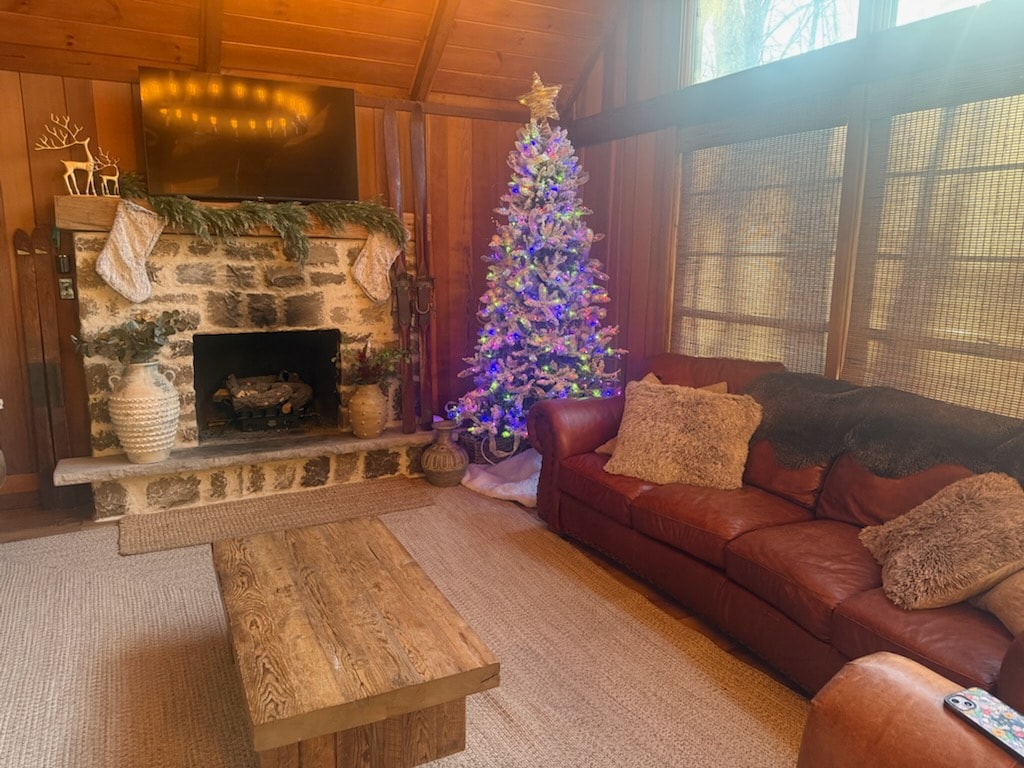 Vaulted ceilings, living room fireplace, 2 first floor bedrooms in this airy and private 4-season cabin with easy access to the amenities in the area. The house is a short walking distance to the indoor pool (open Labor Day to Memorial Day), and just a street away from a beautiful state park with over 2000 acres to explore with trails and a sandy beach 250 acre lake. The outdoor pool, beaches, tennis courts and more are open Memorial Day to Labor Day. 3 Ski slopes are less than 30 minutes away.