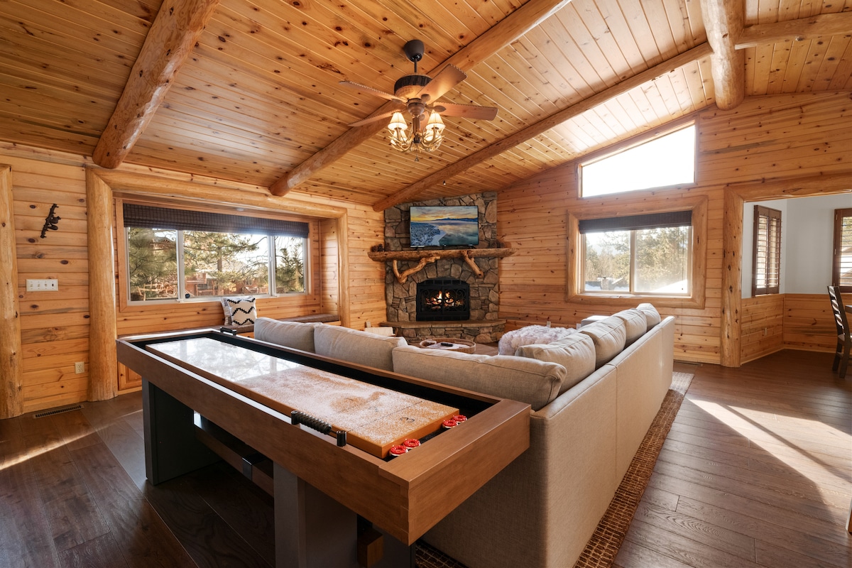 Bear Hugs is an inviting open-concept cabin adorned with Hudson Bay wool blankets, Restoration Hardware, and custom rustic furnishings. A smart and nostalgic retreat, just steps from the lake, a short walk to the village, and minutes drive from the slopes, Bear Hugs has emerged as a beloved gem in Big Bear Lake. Experience the perfect blend of the perks and privacy of a standalone home and spa, combined with the elegance, amenities, and cleanliness of a quaint hotel. BBL License: VRR-2024-2883