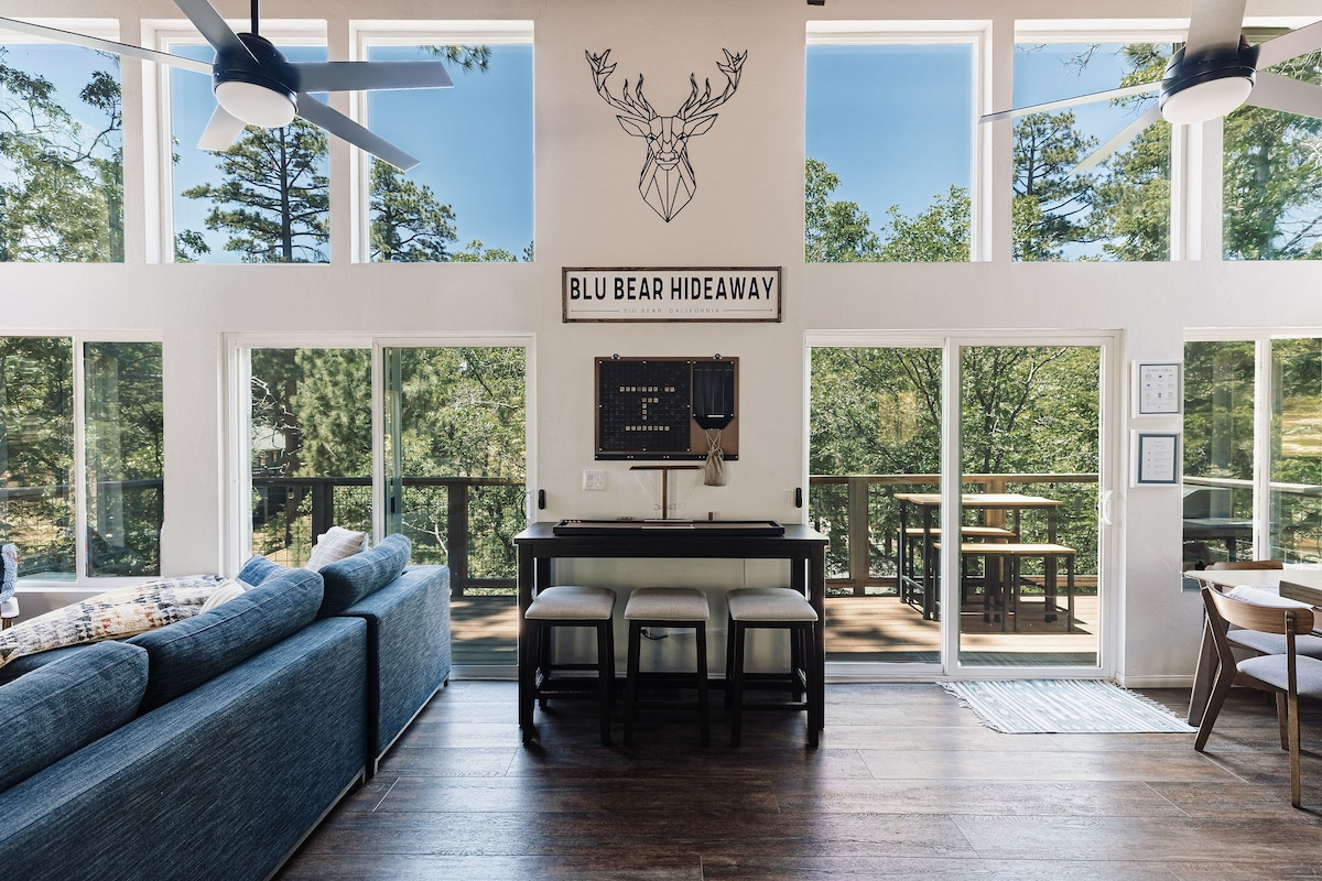 Ski slope views. Renovated modern style cabin in the highly desirable area of Moonridge. The 360° deck features an unobstructed breathtaking view of Bear Mountain & Snow Summit resorts. Enjoy the view from inside the home through the stunning A-frame glass windows. Relax in the steaming hot jacuzzi on the deck while gazing at the stars. The cabin is located near Bear Mountain resort, the golf course & the Zoo. The lake & the Village are a short drive (Note: 42 Stairs ).