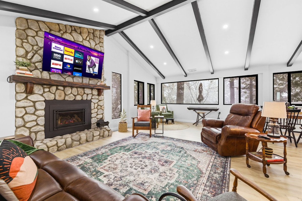 As you walk up stairs passing native boulders and trees, you see an A-frame cabin in the woods begin to peek out, inviting you. Once upon the front deck, the large pane windows draw you into this spacious, high-ceiling, open-concept cabin. Inside, these same windows that drew you in, will encourage the same gazing now, except outwardly. Tastefully designed and relaxing, you may not want to leave, though Big Bear, and Lake Arrowhead all beckon within 30 mins drive... Welcome to The Scandia 🦌