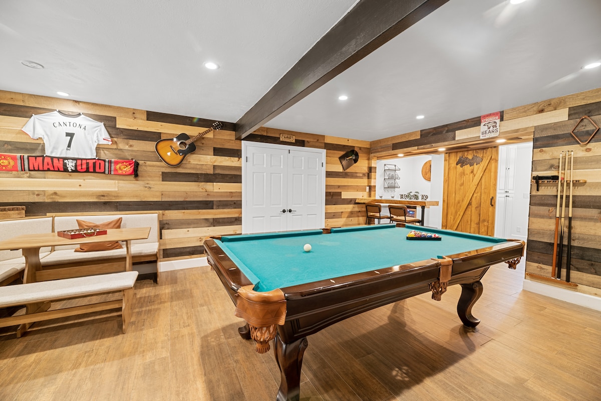 No detail’s been overlooked at our luxurious mountain retreat on 1/2 acre in Moonridge. Sleeps 8. Soak in the jacuzzi, enjoy coffee or cocktails on the porch swing, sit around the fire table or outdoor dining set, BBQ or make pancakes on our huge grill. Use the Peloton or private sauna. Play pool, foosball, ping pong, darts or our arcade game! Chill on our reclining sofa; watch movies or the game. Lake, slopes, shops & restaurants nearby but you may not want to leave the house!