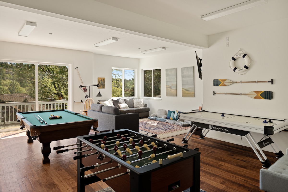 Escape to Big Bear, CA, in our 5 bedroom, 2 level cabin for up to 12 guests. Enjoy 7 x 4K TVs, multiple living areas, media room, a large loft, and a small gym. Stay entertained with foosball, air hockey, shuffleboard, horseshoes, cornhole, darts, and 1,000's of arcade games. The digital game board table adds a modern twist to classic board games. You'll be surrounded by wildlife and tranquility - it's the perfect retreat for you, your family and friends! Book your getaway today!