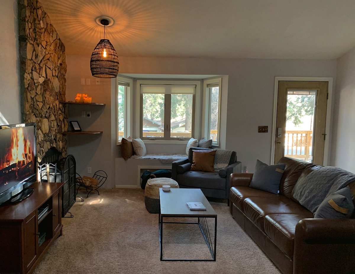 Enjoy this newly built, Bohemian styled cabin in the woods. Perfectly located in the desired Moonridge neighborhood less than a mile from Bear Mountain and Snow Summit Resorts. Walking distance to the Alpine Zoo, golf, biking/hiking trails & restaurants. The village and lake are just miles away. Enjoy private parking, a fully equipped gourmet kitchen, spacious bedrooms and 2 full bathrooms, smart TVs, dedicated work area, high speed Wi-Fi, and a fenced in backyard complete with hot tub!