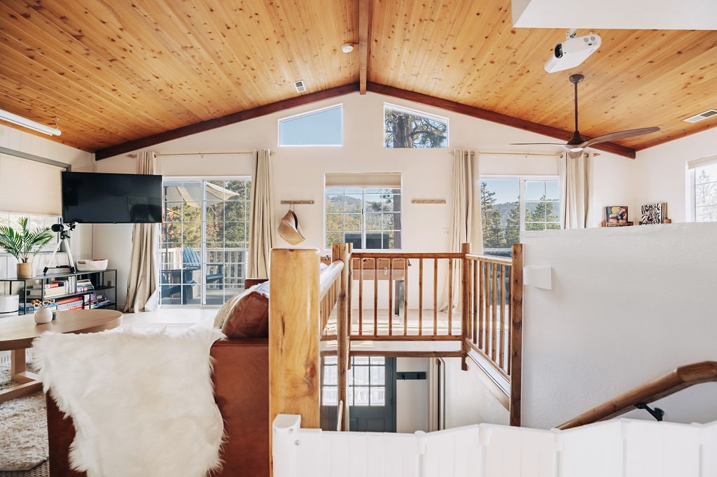 A cozy, mid-century A-frame nestled in a peaceful neighborhood on the north side of Big Bear Lake, but just minutes away from restaurants, shopping, skiing and more. • Panoramic views of both Bear Mountain and Snow Summit from the expansive deck • Quiet, family-friendly neighborhood • Just 3 houses in from the National Forest and miles of hiking trails • Perfect space for a romantic getaway or relaxing with family and friends • Mid-century modern decor • Efficient wood-burning stove