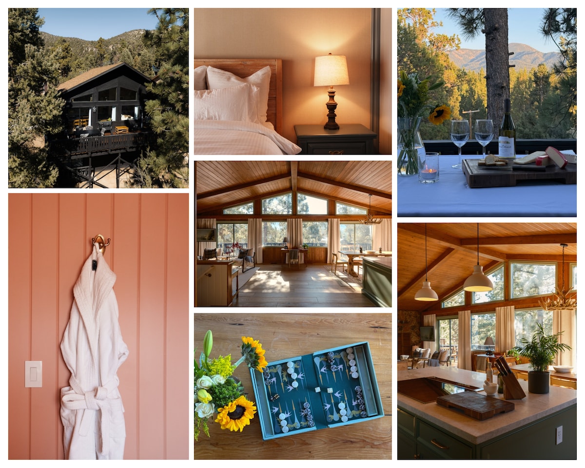. Walking distance to the Big Bear Mountain Resort . Stunning sunsets from the deck . Pets welcome . Fully Equipped Kitchen w/high end Smeg + Hallman Appliances . Large Furnished Main Deck w/ Stunning Lake +Forest Views . A-Frame + Open Concept Lounge/Dining/Kitchen . Movie Room w/high-resolution projector . BBQ/Grill . Hiking Trails right outside our doorstep . High-speed Wi-Fi + Workspace . Central Heating + Fireplaces . Hot Tub on a covered deck offering privacy + scenic views year-round!