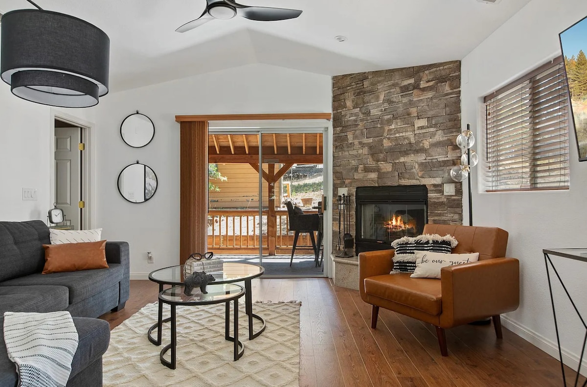 Escape to the mountains in this stylish and newly remodeled 4-person cabin, designed by an architect with your comfort in mind. Enjoy the fresh air from your private hot tub. Inside: One bedroom: Featuring a comfortable queen-size bed. Living area: Relax on a plush sleeper sofa perfect for two guests. Outside: Private hot tub: Soak in the warmth and enjoy the mountain scenery. Location: Conveniently located near Big Bear Lake and within easy reach of the ski slopes via direct bus service.