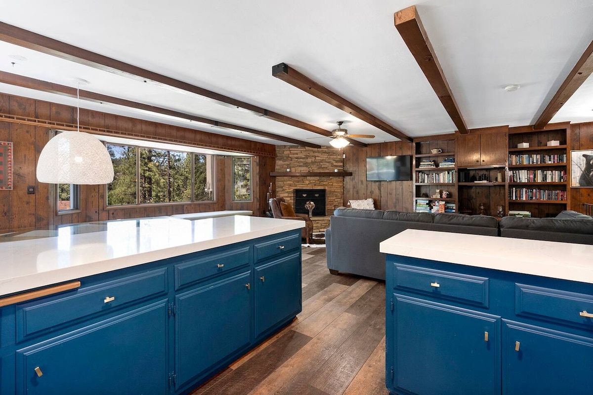 Welcome to Wildwood Haven. Stay with us, enjoy a mountain getaway tucked away in beautiful Moonridge in Big Bear. The cabin is centrally located to all the winter resorts, ski shuttle stop, the lake, shops & restaurants. The property sits on a large, serene lot surrounded by trees that offer privacy and a peaceful treehouse feel. The living room soaks in natural light through the large glass doors along the back wall that opens up to the wrap-around deck with outdoor dining set.