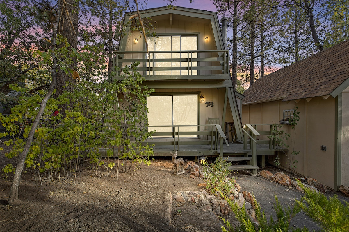 Balsam Bungalow is a Mid-century bungalow, nestled on a piney hillside, with state forest and Lake views, in the exclusive & charming Moonridge neighborhood. Walk/drive to Big Bear slopes located .3 miles away. Snow Summit 9 min drive. State Forest Hiking trails 2 blocks away. Snuggle by the masonry fireplace & take in the picturesque view w/ ceiling to floor windows. Enjoy the wooded yard with wrap around deck, fire pit, BBQ, eating area & scenic hot tub- that is serviced after each guest.