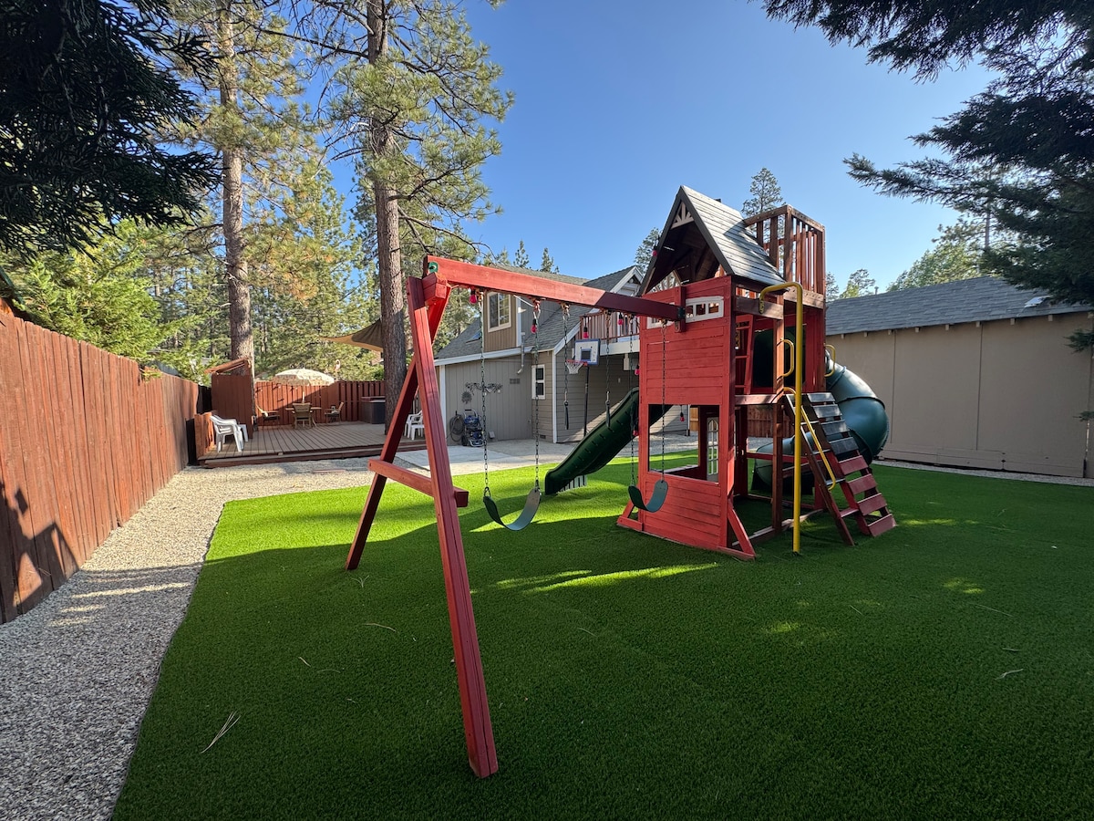 Pass through an A-frame doorway into this charming Sierra-style cabin boasting vaulted wood-beamed ceilings with skylight windows. Belly-up to a live-edge table for breakfast, then sit on a chaise sofa and strum a folksy tune on the acoustic guitar. - Located right between Bear Mountain and Snow Summit Ski Resorts (some of our neighbors even walk to the slopes!) - Close proximity to Big Bear Lake! - Mere minutes from the dining and shops of charming and lively Big Bear Village! - Quiet neighborhood with local hiking and biking trails for the outdoor enthusiast (the National Forest is just a walk away)! - A stone’s throw to Bear Mountain Golf Course, as well as Big Bear Alpine Zoo! - Built-in outdoor grill, kids playhouse, wood swing and fire pit located in backyard! - Movies, board games, vintage vinyl records, record player and guitar provide the entertainment! - Sleeps 4 comfortably with a 2 car driveway. - Follow us on Instagram: @yemodernrustic . Tag us on your Big Bear adventures! Ye Modern Rustic is family-friendly and suitable for up to four guests looking for a warm, cozy Big Bear experience. The decor is modern rustic and is intended to maximize comfort, spaciousness and functionality. The cabin is just under 900 square feet so you'll have plenty of space to unwind. Nestled between both premiere local ski resorts and a short drive to Big Bear Village, you’d be hard-pressed to feel more centrally located. Whether spending a long day on the slopes, local trails, golf course or lake, rest assured that you’ll come home to a cabin fitted with modern amenities that are designed to allow for a relaxing evening in front of the fireplace or outside under the stars making s’mores! Family friendly: Ye Modern Rustic is a family friendly cabin. In addition to our close proximity to the slopes, lake, hiking trails and the zoo, there's a large entertaining space in the living room. Have either the grown-ups or kids sample a movie from our expansive DVD and Blu Ray library (we have titles for all ages!). For the outdoor adventurer, have the kids venture outside to use their imagination in the converted playhouse located in our backyard (visible from the kitchen). The cabin is also equipped with a washer and dryer for life’s little accidents. Cooking: If a meal out on the town feels taxing, you'll have the flexibility the stay in and cook. Our kitchen is stocked with pots, pans, plates, glassware and utensils. If you're unsure about what we might have, ask us. In addition to our built-in stainless steel outdoor BBQ grill, we provide a coffeemaker, toaster, microwave, and refrigerator. Our gas stove allows you the ability to whip up a meal for the entire crew! Fireplace: The wood-burning fireplace is fully functional and will keep you warm on the coldest of nights. Grab some firewood from a local gas station or grocery store (you can find it just about anywhere), and enjoy an evening in front of the fire. Our cleaning staff will dispense with the ashes so no need to clean up! Bedrooms: The main bedroom contains a queen bed while the second bedroom sports a bunk bed with a twin mattress on top and a full mattress on the bottom. All mattresses are fitted with comfy sheets, linens and pillow cases. Our cleaning crew will wash bedding when you leave so no need to clean up. Both bedrooms come with ceiling fans, as well as empty closets and dressers that allow for ample storage on longer stays. Unpack and stay awhile! Bathroom: The shared bathroom has been tastefully updated with modern fixtures and new tile flooring. There is a timed ceiling heater to help get you through colder winter mornings. Fresh towels are available for all, in addition to an ample supply of toilet paper, shampoo, conditioner and body wash. Entertainment/WiFi: Our cabin is WiFi enabled so, in addition to choosing amongst our library of movie titles, our large HDTV/Blu Ray player is Netflix, HBOGo and Hulu capable (you will need to log in with your account). Classic board games (Monopoly, LIFE, Sorry!, Operation, Uno & more!) are available and allow for a fun night in with friends or family. Sample our collection of curated, vintage vinyl records while enjoying a night of games or cozy conversation by the fire. Spin some campfire tunes or grab our acoustic guitar and write your own! Backyard: Our yard contains a new, built-in 4 burner BBQ grill (grilling tools are available in the kitchen cabinets), in addition to a wooden swing and fire pit. Surround yourself with tall pine trees, make s’mores and relax with a quiet evening under the stars! Keep the kids busy with a play house furnished with a play kitchen and doctor play set. With our tabletop paper holder (we supply the drawing paper roll and markers), have them draw a nature-inspired masterpiece! Trash: Because of our location in the mountains and the local critters that live there, all trash must be taken with you to the Clean Bear Site at 41970 Garstin Dr, Big Bear Lake, CA 92315. Each bag of trash left on the property is subject to a $50 penalty/deduction from your security deposit. Dumping your trash anywhere else will forfeit your entire security deposit. Big Bear has a $1000 fine for littering, please keep our community clean and safe for the local wildlife. Pets: While we love dogs (and pets in general), we are currently a pet free cabin. Thanks in advance for your understanding. You have the whole cabin, deck, and yard to yourself. We also use a touch-pad, pin-code lock system instead of keys in order to make things easier and safer for our guests. We provide a rustic getaway with plenty of privacy. If there is a problem (or if you have questions), we are a simple phone call or text away. We’re here to help! We’ve also prepared a list of local recommendations to help you enjoy your stay in Big Bear to the fullest (located in the cabin)! The cabin is nestled among pines in the Moonridge neighborhood of Big Bear Lake. The Big Bear Alpine Zoo and Bear Mou