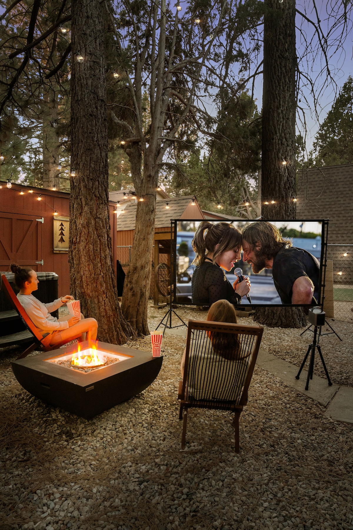 带热水浴缸的小木屋 • 户外电影屏幕 • 火坑