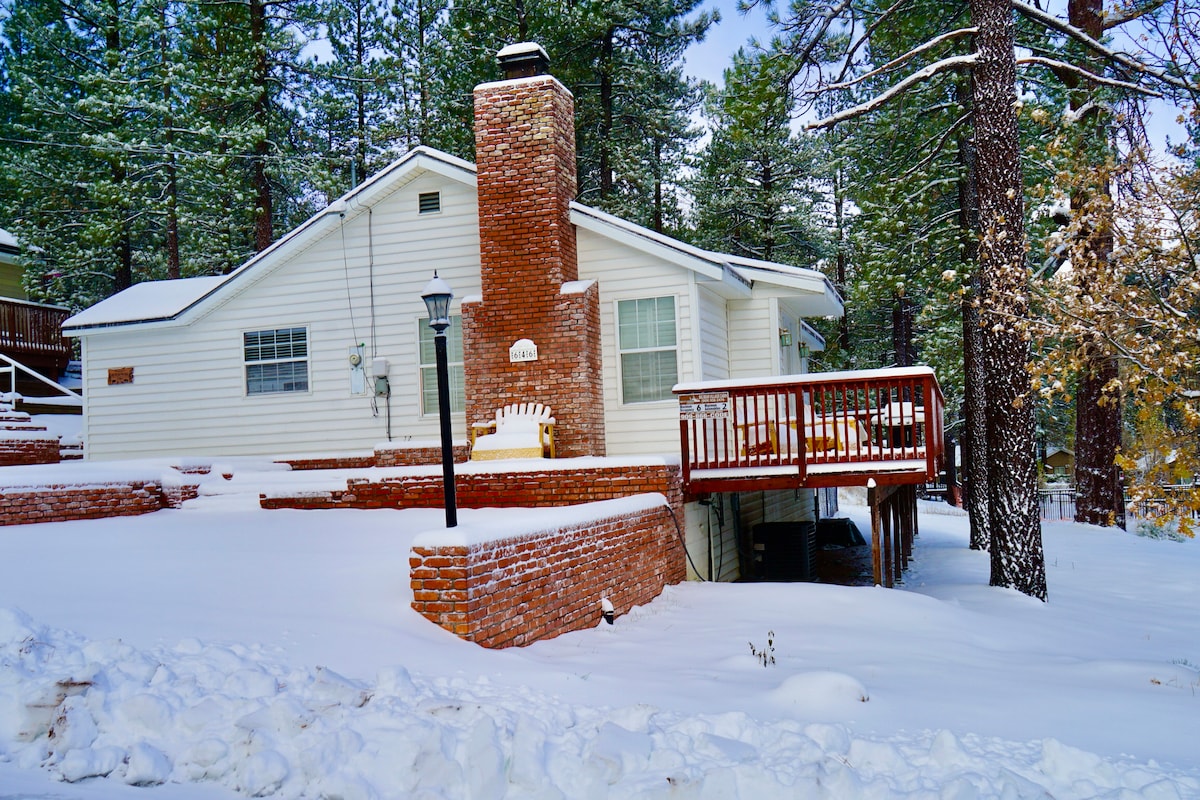 PERMIT MAX: 7 PEOPLE & TWO CARS. LOCATION, LOCATION, LOCATION!!The Bear Necessities is a family+dog friendly, centrally located, A frame cabin on a ~1/3 acre flat lot with tons of tall trees, deck, 7 person Caldera hot tub, fully fenced backyard, 720+sq ft great room, open concept kitchen, game room (separate entrance), 2 bedrooms, 2 baths, & pull out couch. Less than 5 mins from Snow Summit, Bear Mountain, lake, Zoo, Golf Course & mini golf, grocery stores, restaurants, hiking.