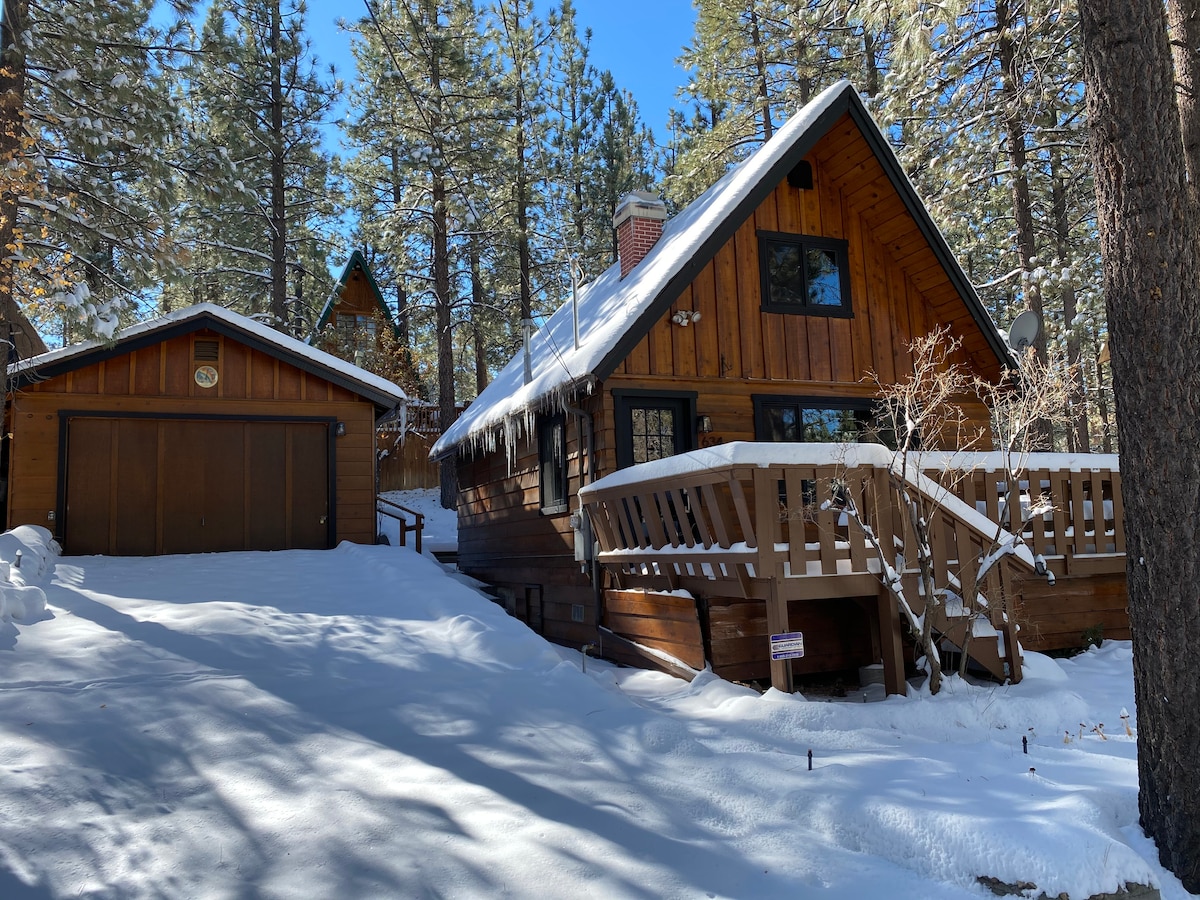 This perfect little Aframe cabin backs the forest! Hiking, biking & the view is what you'll have direct access to at this mountain retreat. Located on a quiet street near Bear Mt. Ski Resort,tucked into the trees, you'll find this mid-century modern cabin.If you are looking for a romantic hide-away,a double couple adventure or a place for your besties to re-connect & unwind, this truly is the coolest cabin in Big Bear Lake.Highly sought after cabin, it will book up fast!Not for children under 6.