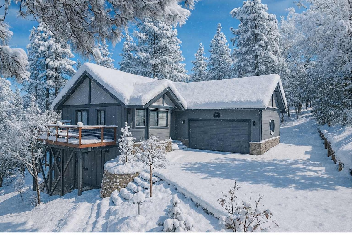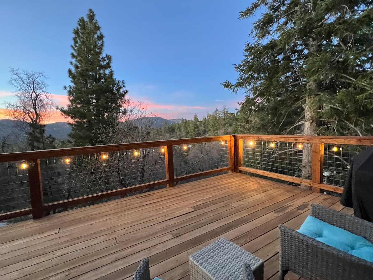 This Black A-Frame style cabin nestled in the trees of Running Springs. Surrounded by grand pine and cedar trees, it makes you feel like you are exploring tree tops. This cabin has decks on each of its 3 levels to appreciate it even more. You are greeted with a mid-century modern styling throughout the home that take you back to a golden era of design. Enjoy snuggling in the A-frame loft, get lost in a good book, enjoy some classic music, or enjoy a film in the secret cinema room...