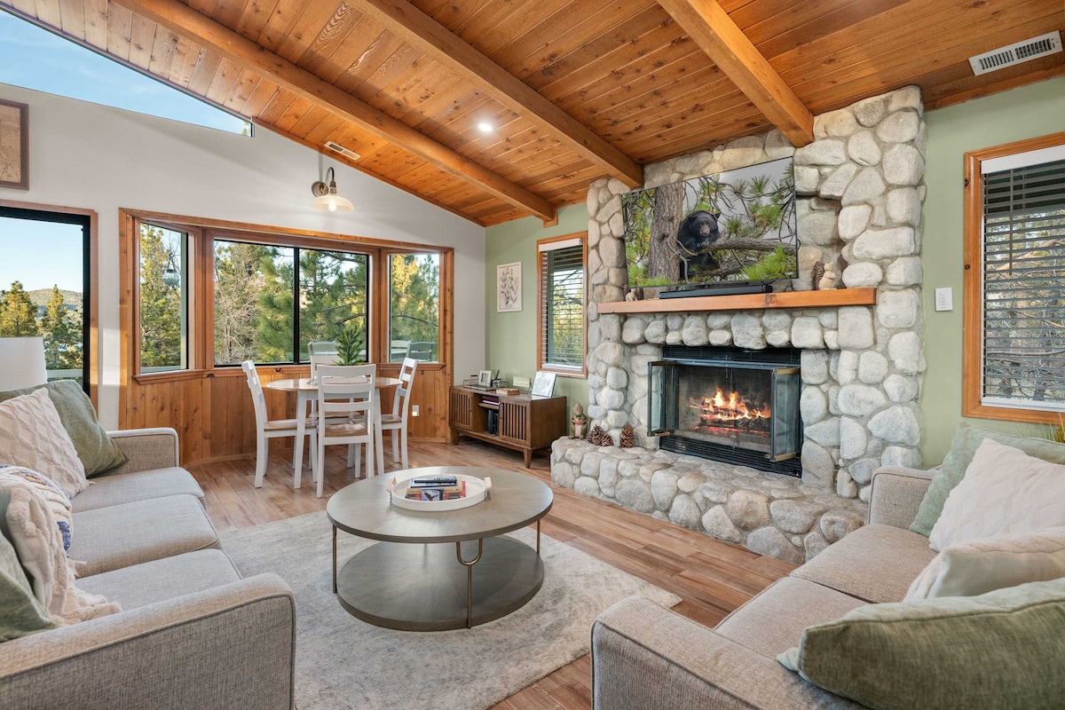 PERMIT MAX: 7 PEOPLE & TWO CARS. LOCATION, LOCATION, LOCATION!!The Bear Necessities is a family+dog friendly, centrally located, A frame cabin on a ~1/3 acre flat lot with tons of tall trees, deck, 7 person Caldera hot tub, fully fenced backyard, 720+sq ft great room, open concept kitchen, game room (separate entrance), 2 bedrooms, 2 baths, & pull out couch. Less than 5 mins from Snow Summit, Bear Mountain, lake, Zoo, Golf Course & mini golf, grocery stores, restaurants, hiking.