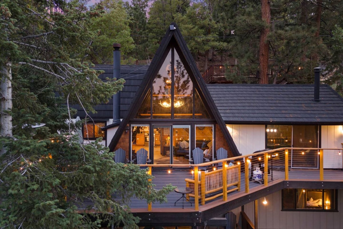 . Walking distance to the Big Bear Mountain Resort . Stunning sunsets from the deck . Pets welcome . A-Frame + Open Concept Lounge/Dining/Kitchen . Fully Equipped Kitchen w/high end Smeg + Hallman Appliances . Large Furnished Main Deck w/ Stunning Lake +Forest Views . Movie Room w/high-resolution projector . BBQ/Grill . Hiking Trails right outside our doorstep . High-speed Wi-Fi + Workspace . Central Heating + Fireplaces . Hot Tub on a covered deck offering privacy + scenic views year-round!