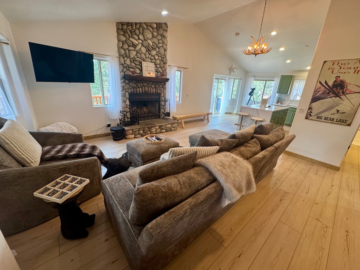 . Walking distance to the Big Bear Mountain Resort . Stunning sunsets from the deck . Pets welcome . Fully Equipped Kitchen w/high end Smeg + Hallman Appliances . Large Furnished Main Deck w/ Stunning Lake +Forest Views . A-Frame + Open Concept Lounge/Dining/Kitchen . Movie Room w/high-resolution projector . BBQ/Grill . Hiking Trails right outside our doorstep . High-speed Wi-Fi + Workspace . Central Heating + Fireplaces . Hot Tub on a covered deck offering privacy + scenic views year-round!
