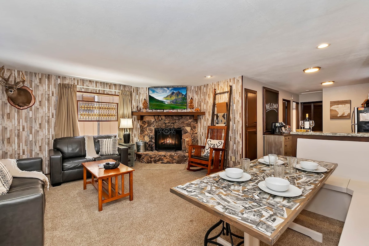 This warm & cozy cabin is just what you are looking for!Brave Stone Cabin is modern and spacious with so many thoughtfully decorated spaces for everyone to spread out or come together.The split level great room features a wood burning fireplace,70"TV,several seating areas,breathtaking wood beam ceilings and a fully equipped kitchen.Enjoy the private deck with BBQ and a fully fenced forested yard!Located in the most desirable area only minutes from the lake,hiking trails,ski resorts and shopping!