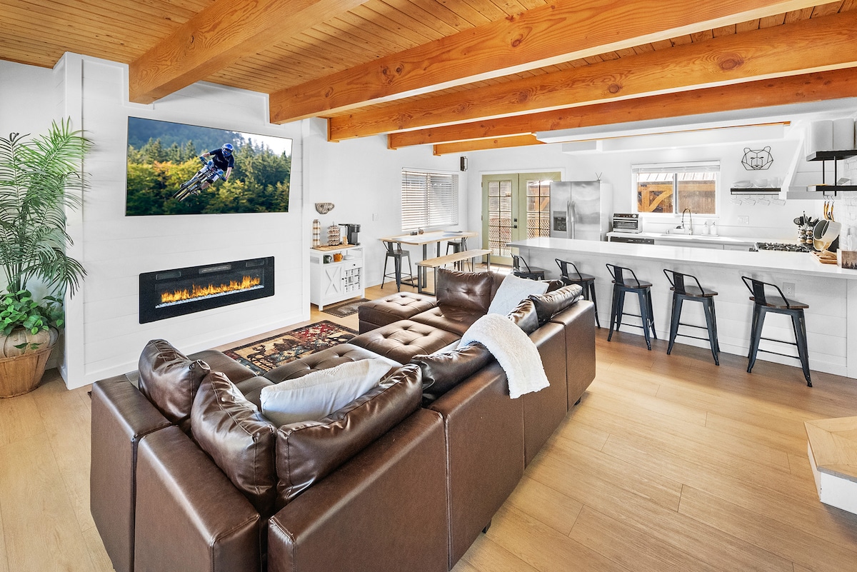 Ye Modern Rustic is family-friendly and suitable for up to four guests looking for a warm, cozy Big Bear experience. The decor is modern rustic and is intended to maximize comfort, spaciousness and functionality. The cabin is just under 900 square feet so you'll have plenty of space to unwind. Nestled between both premiere local ski resorts and a short drive to Big Bear Village, you’d be hard-pressed to feel more centrally located. Whether spending a long day on the slopes, local trails, golf course or lake, rest assured that you’ll come home to a cabin fitted with modern amenities that are designed to allow for a relaxing evening in front of the fireplace or outside under the stars making s’mores!