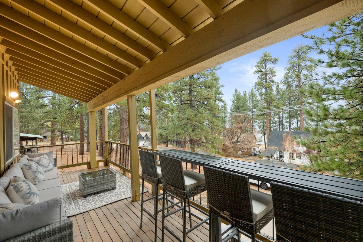 Escape to Big Bear, CA, in our 5 bedroom, 2 level cabin for up to 12 guests. Enjoy 7 x 4K TVs, multiple living areas, media room, a large loft, and a small gym. Stay entertained with foosball, air hockey, shuffleboard, horseshoes, cornhole, darts, and 1,000's of arcade games. The digital game board table adds a modern twist to classic board games. You'll be surrounded by wildlife and tranquility - it's the perfect retreat for you, your family and friends! Book your getaway today!