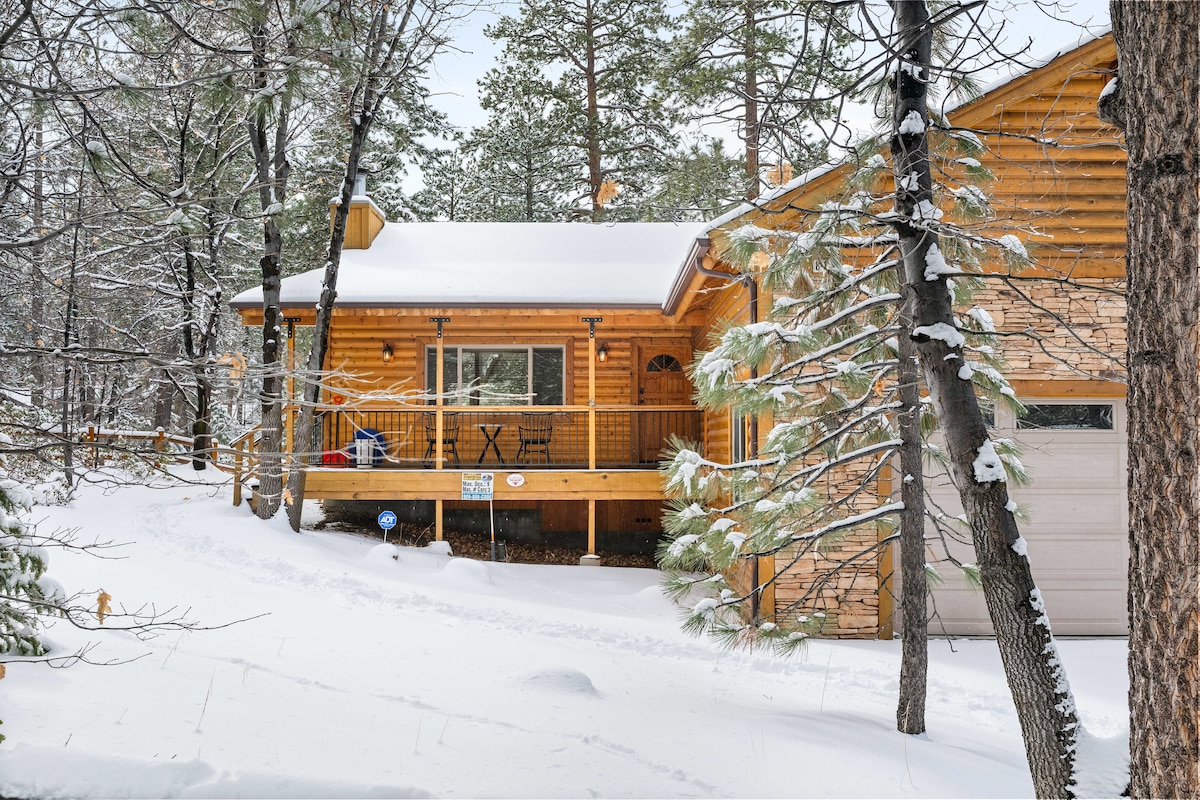 Nestled among the trees and in between two empty lots, our cabin is private yet close to cafe's, shops, dining, and activities. Fully stocked & updated modern cabin has all the amenities you need for a comfortable stay. Cuddle up by the gas fireplace. Gaze at the stars from the hot tub, which has color changing LED and a waterfall. String lights set the ambiance. Relax, unwind, and connect. Quality beddings, RO filtered water, work desk, fast Wifi, & more. Fenced in yard great for the pups!