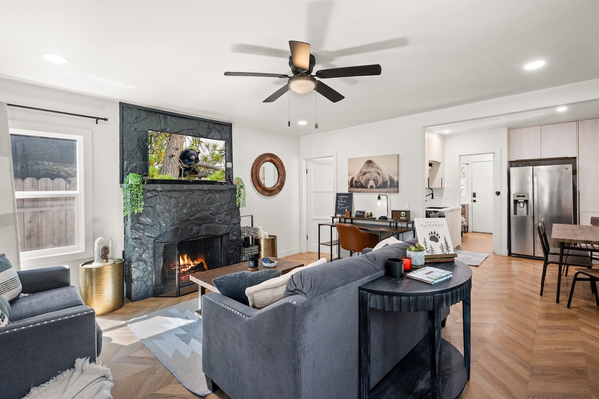 Summit Creek Pines is a recently renovated Big Bear cabin offering modern comfort in a serene neighborhood. It’s within walking distance to the lake, a local park, and ideal for watching the 4th of July fireworks. The home features an open-plan living area with a cozy electric fireplace, a gourmet kitchen, and a fenced backyard with a hot tub. Enjoy a game room, spacious bedrooms with TVs, and convenient amenities like WiFi, parking, and laundry.