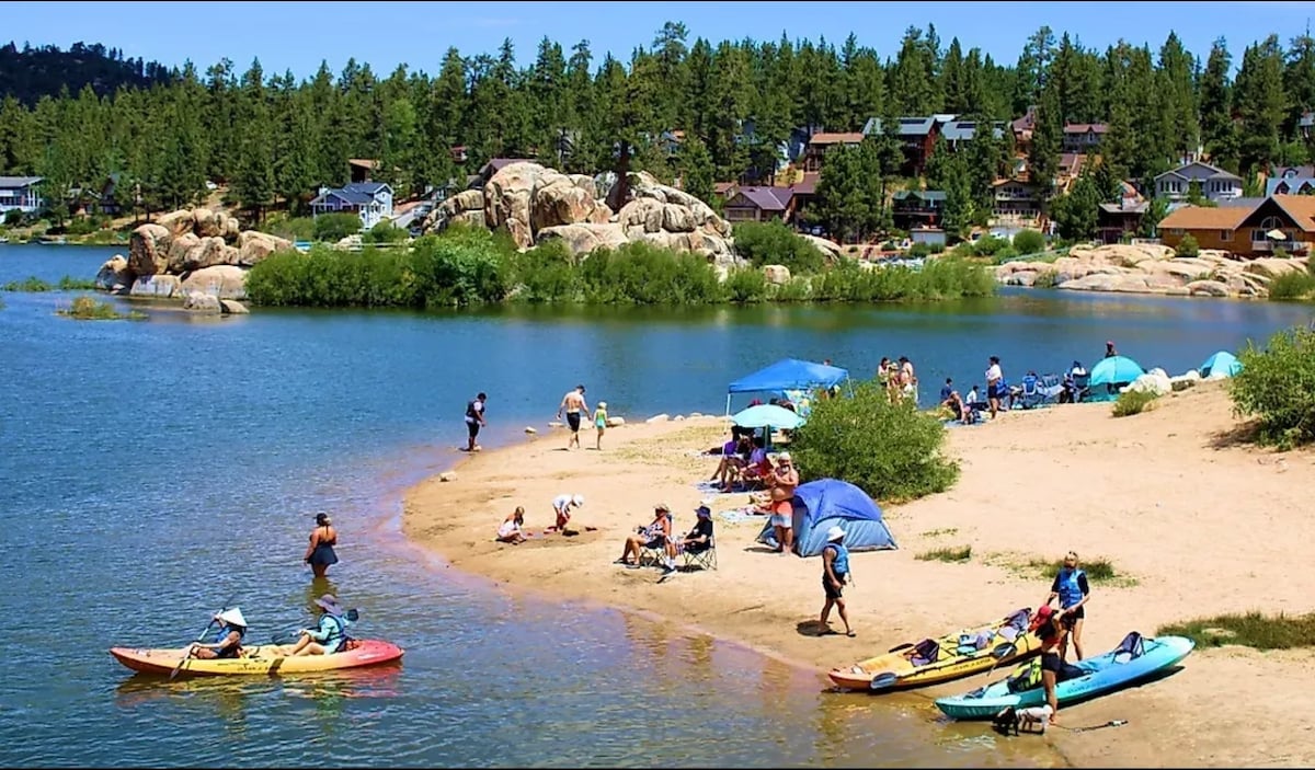 Wake up to stunning Big Bear Lake views from this 3-bedroom cabin with a bunk bed perfect for kids. Enjoy the lake, fishing, or relaxing outdoors with the BBQ and fire pit. The fenced backyard is pet-friendly and has direct access to a walkable path to the lake. The garage game room features an arcade machine, pool table, shuffleboard, basketball game, and TV. Ideal for summer adventures or cozy winter getaways, combining lakefront views, outdoor spaces, and built-in fun for everyone.