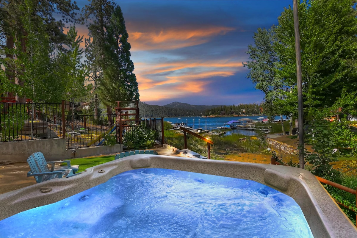 Lakefront Home on Metcalf Bay, Sunset Views, Private Beach, and Deep Water Dock Featured on multiple TV shows, including Staycation, Vanderpump Rules, This is LA, and Design on Time. This charming lakefront cottage is in one of Big Bear's finest neighborhoods. With the best modern lakeside gazebo in Big Bear. This backyard has it all. A heated gazebo with a mini fridge, built-in Lion gas BBQ, state-of-the-art Hot Spring jacuzzi, and large custom gas fire pit overlooking a breathtaking view.