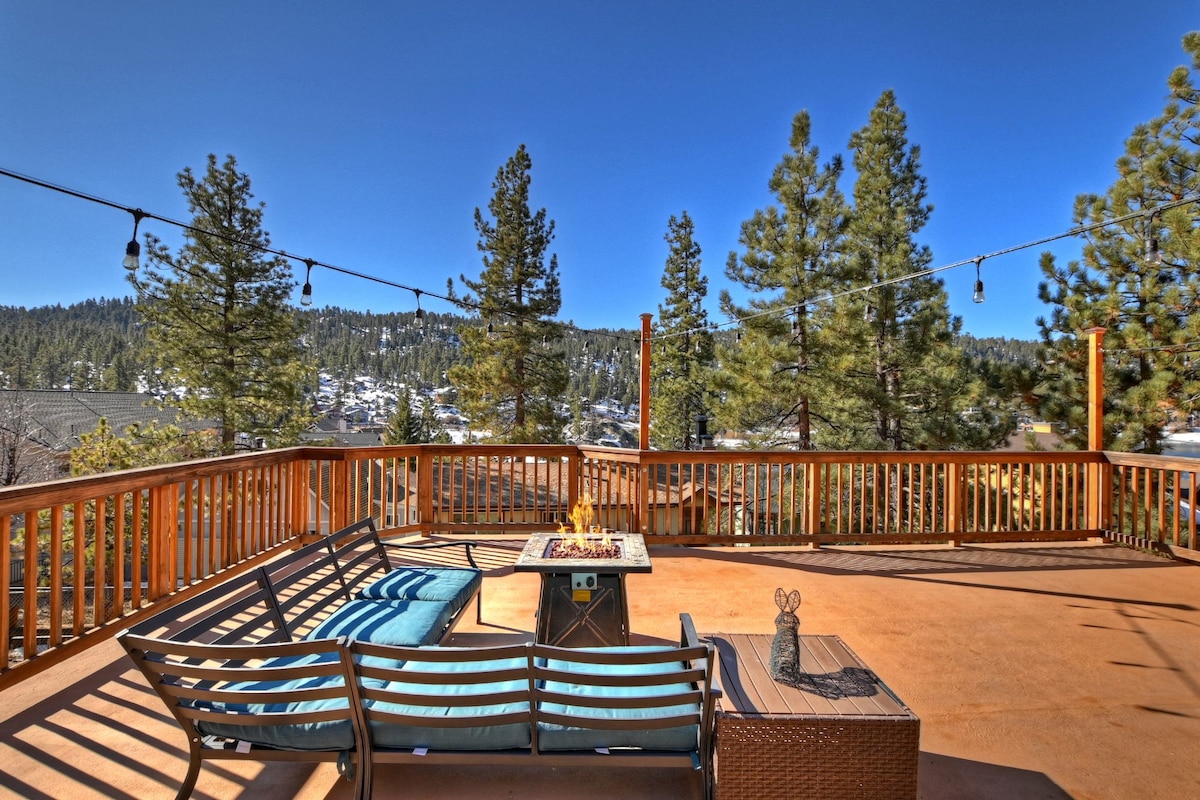 Escape to Big Bear and soak in stunning mountain and lake views from the back deck, complete with a firepit for cozy evenings watching planes take off above the lake. The game room is a showstopper, featuring a pool table, shuffleboard, arcade games, foosball table, and a full bar. Gather in spacious living areas or cook in the large kitchen. The master offers an indoor fireplace and jacuzzi tub. Perfect for families with a bunk bedroom. Just minutes from The Village, trails, and ski slopes.
