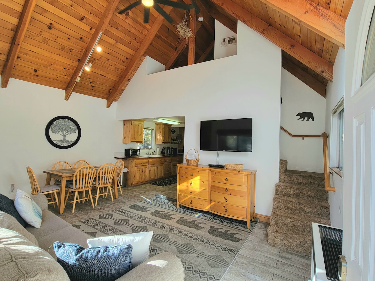 Bear Hugs is an inviting open-concept cabin adorned with Hudson Bay wool blankets, Restoration Hardware, and custom rustic furnishings. A smart and nostalgic retreat, just steps from the lake, a short walk to the village, and minutes drive from the slopes, Bear Hugs has emerged as a beloved gem in Big Bear Lake. Experience the perfect blend of the perks and privacy of a standalone home and spa, combined with the elegance, amenities, and cleanliness of a quaint hotel. BBL License: VRR-2024-2883