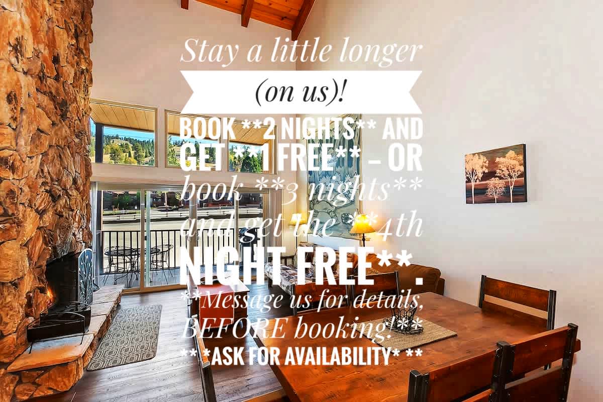 . Walking distance to the Big Bear Mountain Resort . Stunning sunsets from the deck . Pets welcome . A-Frame + Open Concept Lounge/Dining/Kitchen . Fully Equipped Kitchen w/high end Smeg + Hallman Appliances . Large Furnished Main Deck w/ Stunning Lake +Forest Views . Movie Room w/high-resolution projector . BBQ/Grill . Hiking Trails right outside our doorstep . High-speed Wi-Fi + Workspace . Central Heating + Fireplaces . Hot Tub on a covered deck offering privacy + scenic views year-round!