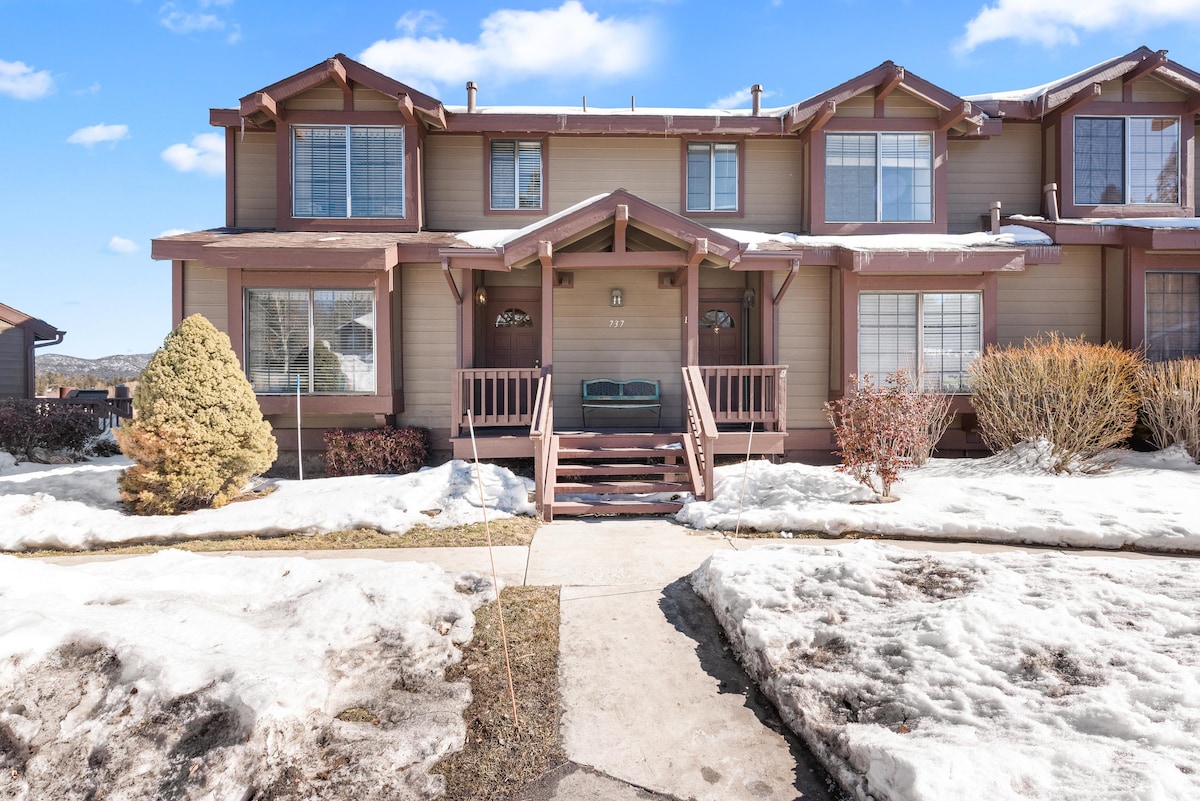 LIC VRR-2025-0380. 2 bed, 2 1/2 ba at Snow Summit. 500 ft to the Resort. 2nd floor: Kitchen, living, dining, and 1/2 bath. 1st floor bedrooms, two baths, and laundry. Relax in private spa. Full kitchen. Drip and Keurig coffee. Keurig pods and cone filters included. Gas fireplace, Living rm has 70 in TV with Cable, 200 channels & Apple TV. Master has 55 in TV with cable tv. Community pool is open May through Labor Day.