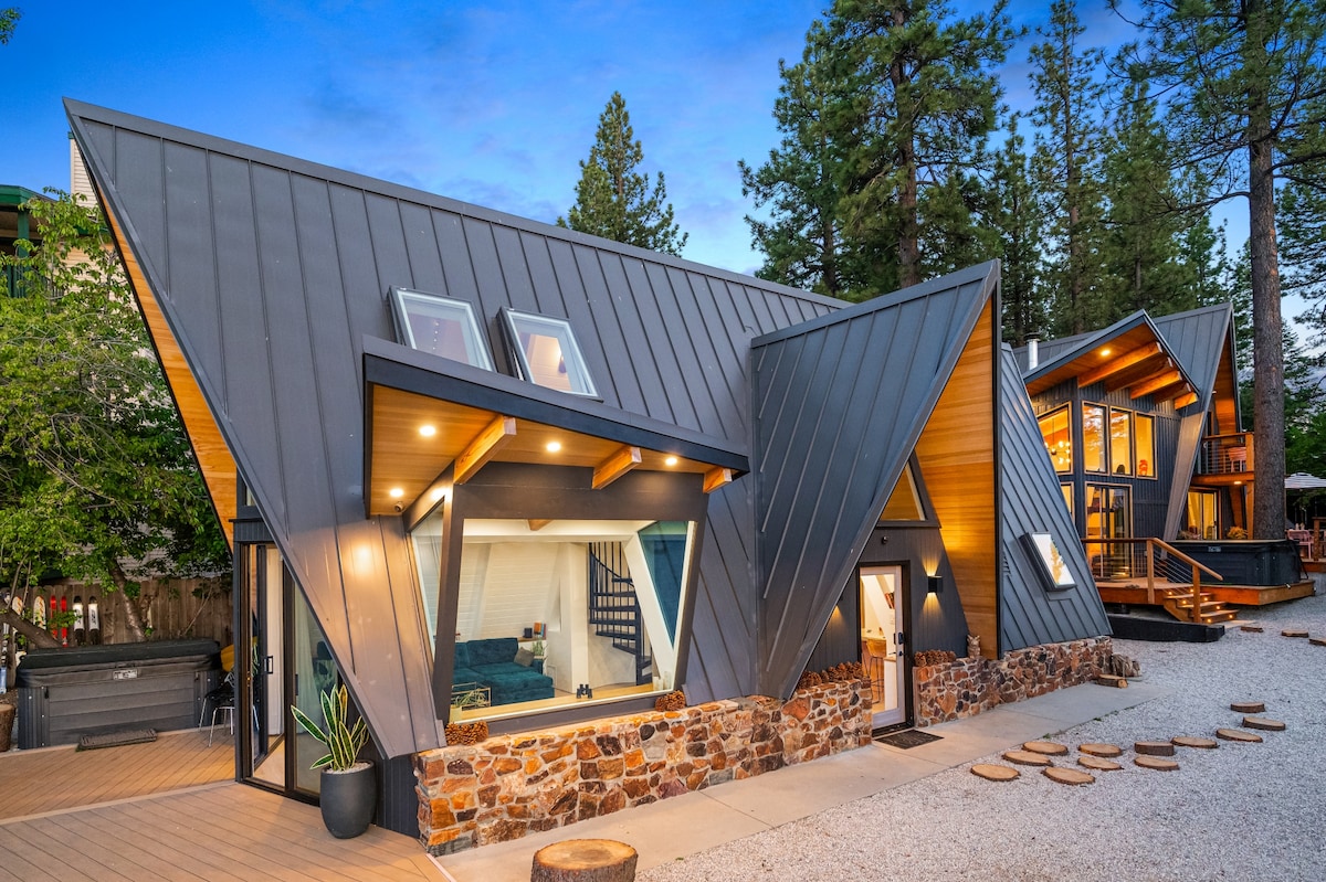 . Walking distance to the Big Bear Mountain Resort . Stunning sunsets from the deck . Pets welcome . Fully Equipped Kitchen w/high end Smeg + Hallman Appliances . A-Frame + Open Concept Lounge/Dining/Kitchen . Large Furnished Main Deck w/ Stunning Lake +Forest Views . Movie Room w/high-resolution projector . BBQ/Grill . Hiking Trails right outside our doorstep . High-speed Wi-Fi + Workspace . Central Heating + Fireplaces . Hot Tub on a covered deck offering privacy + scenic views year-round!